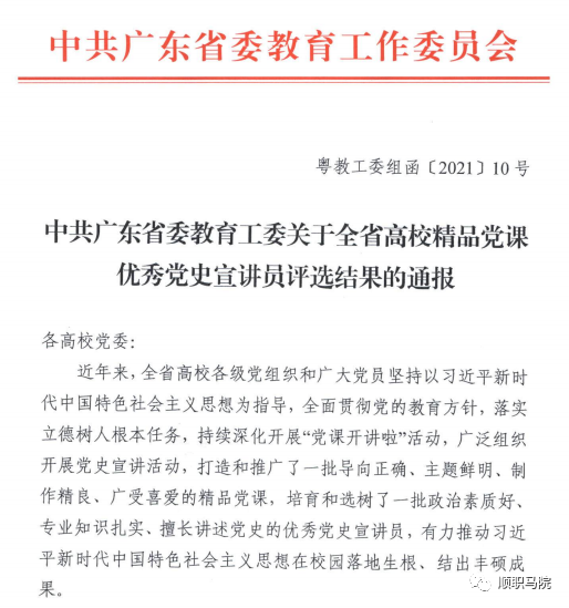 近日,中共广东省委教育工委公布了全省高校精品党课、优秀党史宣讲员评选结果,共评选出100部精品党课,60名优秀党史宣讲员,我院周紫玲副教授主讲的题为“恰是风华正茂时:中国共产党百年奋斗史之曾经沧海变粤港澳合作新模式示范区——顺德知青围垦中心沟”的微党课入选百部精品党课,我院罗乔丽老师入选优秀党史宣讲员。