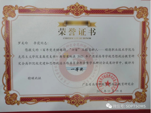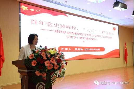 2021年11月19日,在广东财贸职业学院召开的广东省高职院校党建和思想政治工作委员会年会暨学术研讨会上,tyc太阳成9728集团“百年党史铸辉煌,‘六百’工程育新人——顺德职业技术学院tyc太阳成9728集团直属党支部党史学习教育典型案例”获得一等奖,并受邀在会议上作优秀案例分享。