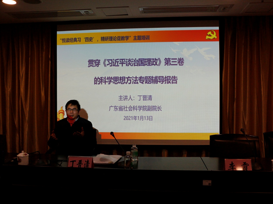 1月13日,培训以省社会科学院丁晋清副院长的“贯穿《习近平谈治国理政》第三卷的科学思想方法”及“申报思政课题应遵循的基本原则”两场报告拉开序幕。丁晋清副院长结合自己的学习体会,总结了贯穿《习近平谈治国理政》第三卷的八种科学思想方法、六种科学思维能力、三种科学理念,讲座系统性强,信息量大,理论分析透彻,讲解生动深刻,为老师们悦读经典习“四史"提供了系统科学的学习方法。在第二场报告中,丁晋清副院长认为,申报课题要成功,一是要遵循学术规范;二是要结合中心工作,结合总书记新思想挖掘选题;三是要发挥自己的专业优势,做到扬长避短;四是要有特色和创新,避免雷同和炒冷饭;五是要站在学术前沿;六是要有一定的学术积淀;七是要有问题意识。同时,丁晋清副院长根据以上原则,围绕学习党的十九届五中全会精神、建党100周年、顺德高质量发展等即时提供了十二个选题供大家参考,为老师们的课题申报提供极大帮助。大家普遍认为该报告及时给力,使人受益匪浅。