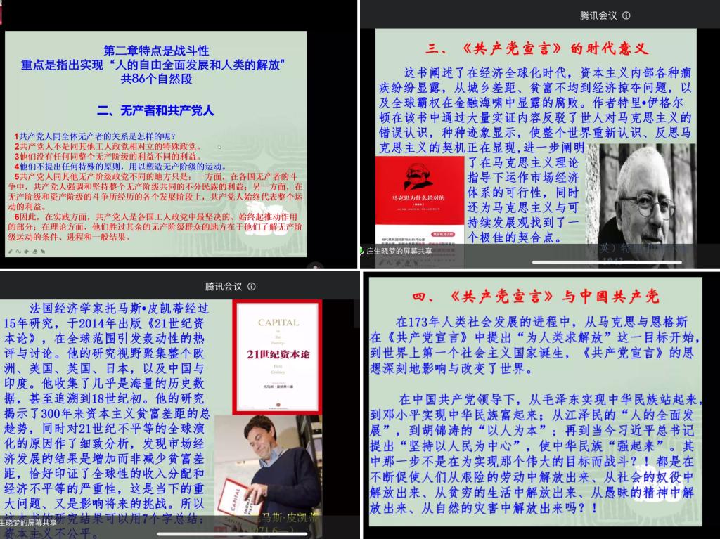 讲座上,叶教授从《共产党宣言》的写作背景、主要内容、时代意义以及《共产党宣言》与中国共产党等四个方面展开讲述。讲述中,叶教授边带领老师们逐段解读《共产党宣言》的各章节特点、丰富内涵,边结合当前社会的热点问题、社会发展和国际实际进行现实对比,深刻透析其时代影响。叶教授指出,《共产党宣言》作为马克思主义研究领域的经典著作,无论在历史意义还是现实意义的维度上,都值得每一位思政课老师不断学习,尤其在建党100周年即将来临之际,深刻理解马克思主义对中国共产党的成长和近代中国发展建设等方面的重要性,对老师们开展教学研究具有不可替代的作用。