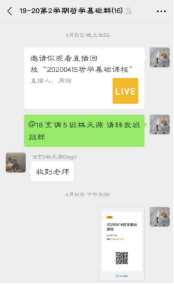 使用企业微信直播,我可以选择“直播回放”录播该讲次课程,对于大班中上课时间冲突的个别小班来说,他们就可选择其他空余时间,在我的辅导下,浏览课堂回放,并通过学习通参与课堂活动。