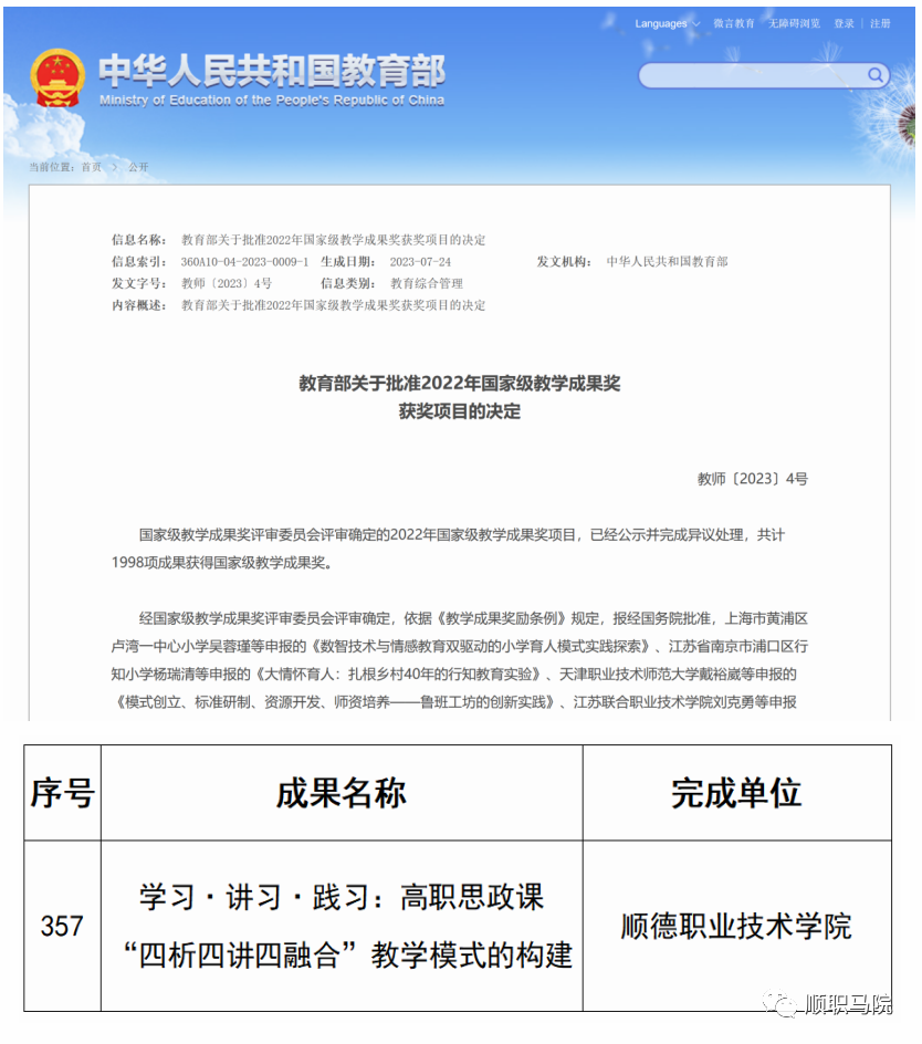 2023年7月24日,教育部发布《关于批准2022年国家级教学成果奖获奖项目的决定》,共计1998项成果获得国家级教学成果奖,其中职业教育类教学成果奖评出特等奖2项,一等奖70项,二等奖500项,tyc太阳成9728集团直属党支部书记李霞教授领衔的教师团队申报的《学习·讲习·践习:高职思政课“四析四讲四融合”教学模式的构建》获得2022年职业教育国家级教学成果奖二等奖,这是学院教育教学成果继获得2021年广东省教学成果奖特等奖后,首次以第一完成单位获得国家级教学成果奖,实现历史性突破。