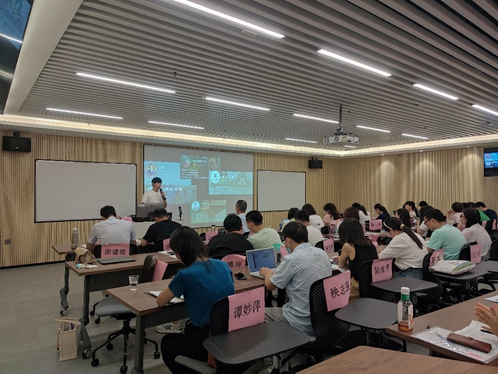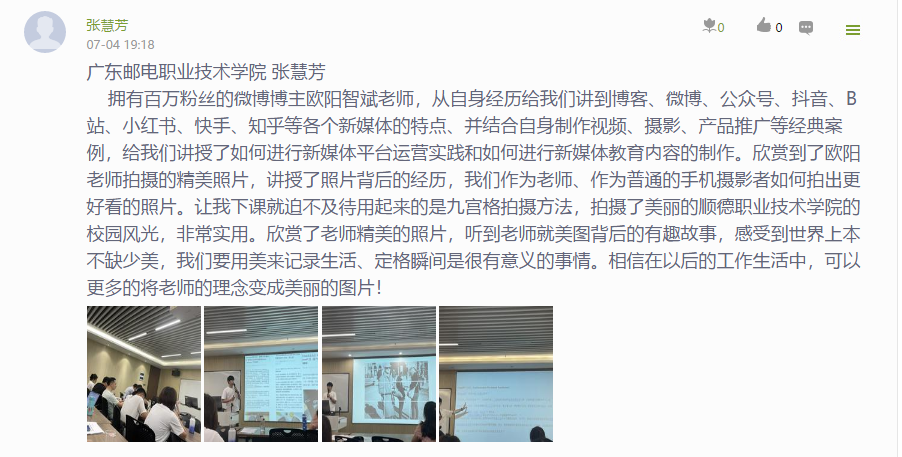 在上午的《新媒体教育平台运营实践》课程中,欧阳智斌老师结合自身的摄影从业经历和自媒体运营经验,分析了互联网和大数据背景下,新媒体平台与新媒体技术的特点与利弊,立足高职院校的教学实际,引导学员多维度思考如何利用新媒体技术对学生成长进行正向价值引导。同时,欧阳智斌老师还讲授了利用新媒体技术开展教育内容制作的要点与心得,为学员们日后丰富教学手段提供了有益参考。