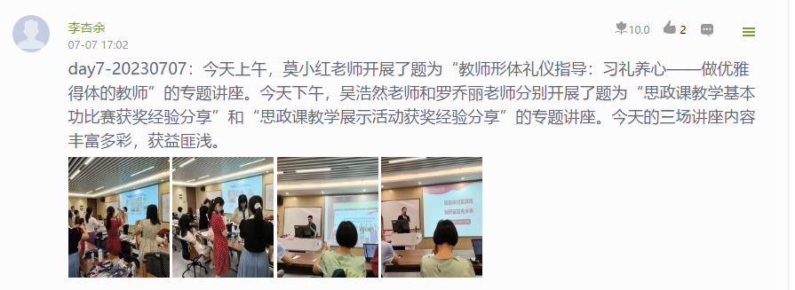 下午,吴浩然老师以广东省高校思想政治理论课青年教师教学基本功比赛为例,为学员们介绍了省教学基本功比赛的基本要求,从比赛规划、教学选题、教学设计、素材积累与搜集、比赛技巧等方面与学员分享了个人备赛、参赛的经验。罗乔丽老师从青年教师的成长出发,以个人参加广东省大中小学思政课一体化教学展示活动为例,从教学选题、教学策略、教学过程、教学效果、心得体会为学员们详细介绍了备赛的攻略。两位老师讲课现场反响热烈,学员们还针对自己在比赛、教学过程中的疑问与两位老师进行交流,两位老师的授课干货满满,得到学员一致好评。