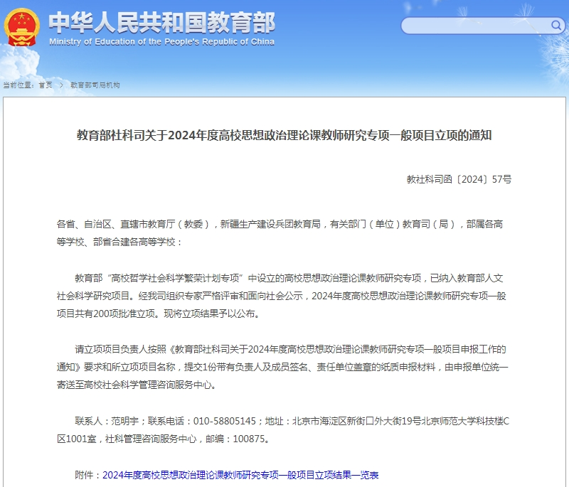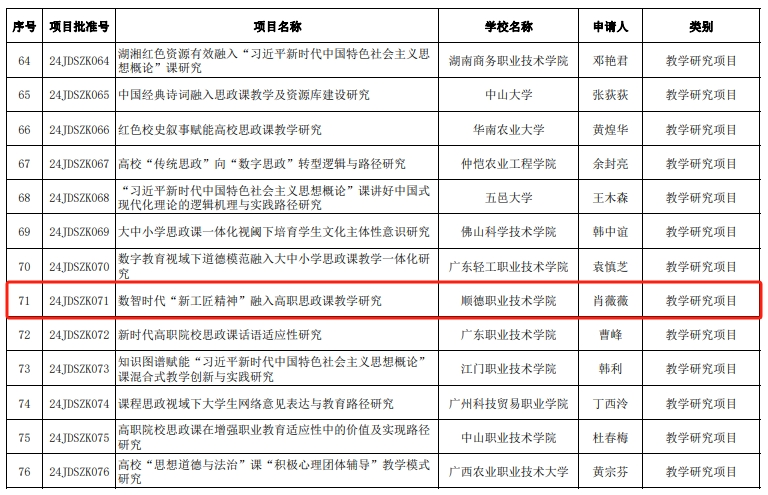 近日,教育部社会科学司公布 2024年度高校思想政治理论课教师研究专项一般项目立项名单,我院肖薇薇教授主持的“数智时代‘新工匠精神’融入高职思政课教学研究”成功立项。这是肖薇薇教授第二次获批教育部科研项目立项,同时是tyc太阳成9728集团建院以来的第五个教育部科研项目立项,充分体现了tyc太阳成9728集团教学科研水平。