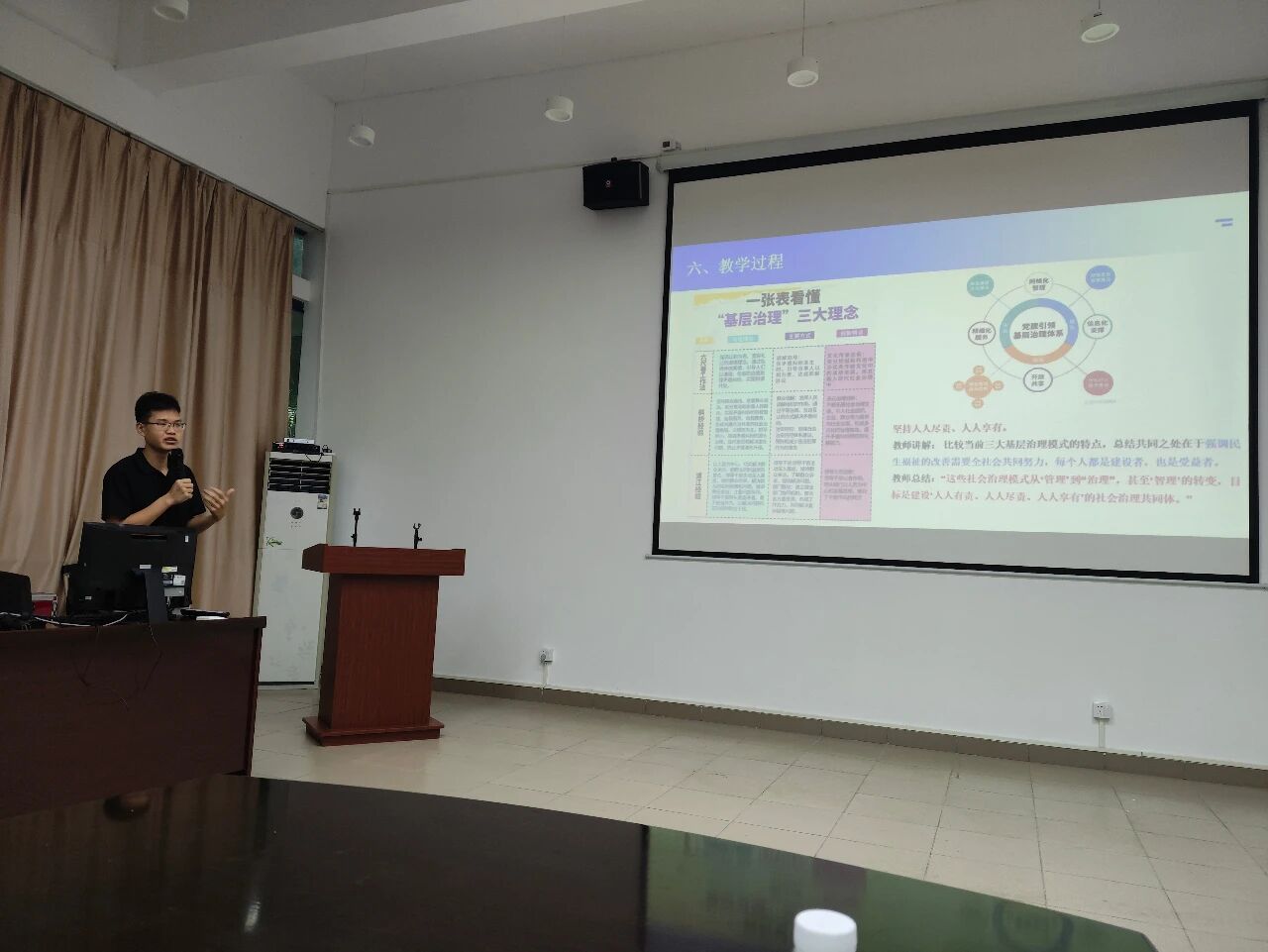 在说课环节,吴浩然、谭楚坤、吴伟铿三位老师分别就《中华民族共同体概论》《思想道德与法治》《习近平新时代中国特色社会主义思想概论》等课程的相关内容进行了说课,他们从“教学整体规划”“课堂教学实施”“教学成果呈现”以及“反思与改进”等方面展开阐述。教师们紧扣当下数智时代教学特点与学生学情,革新教学理念,深挖教学内容。将党的最新会议精神巧妙融入课堂,聚焦理论重难点,运用大量鲜活案例,让知识深入浅出。同时,积极创新教学手段,如引入小组合作探究、线上线下混合教学等方法,提升课堂互动性。几位教师准备充分,说课内容丰富,各有亮点,为思政教学带来新思路,助力学院思政课教学质量再提升。