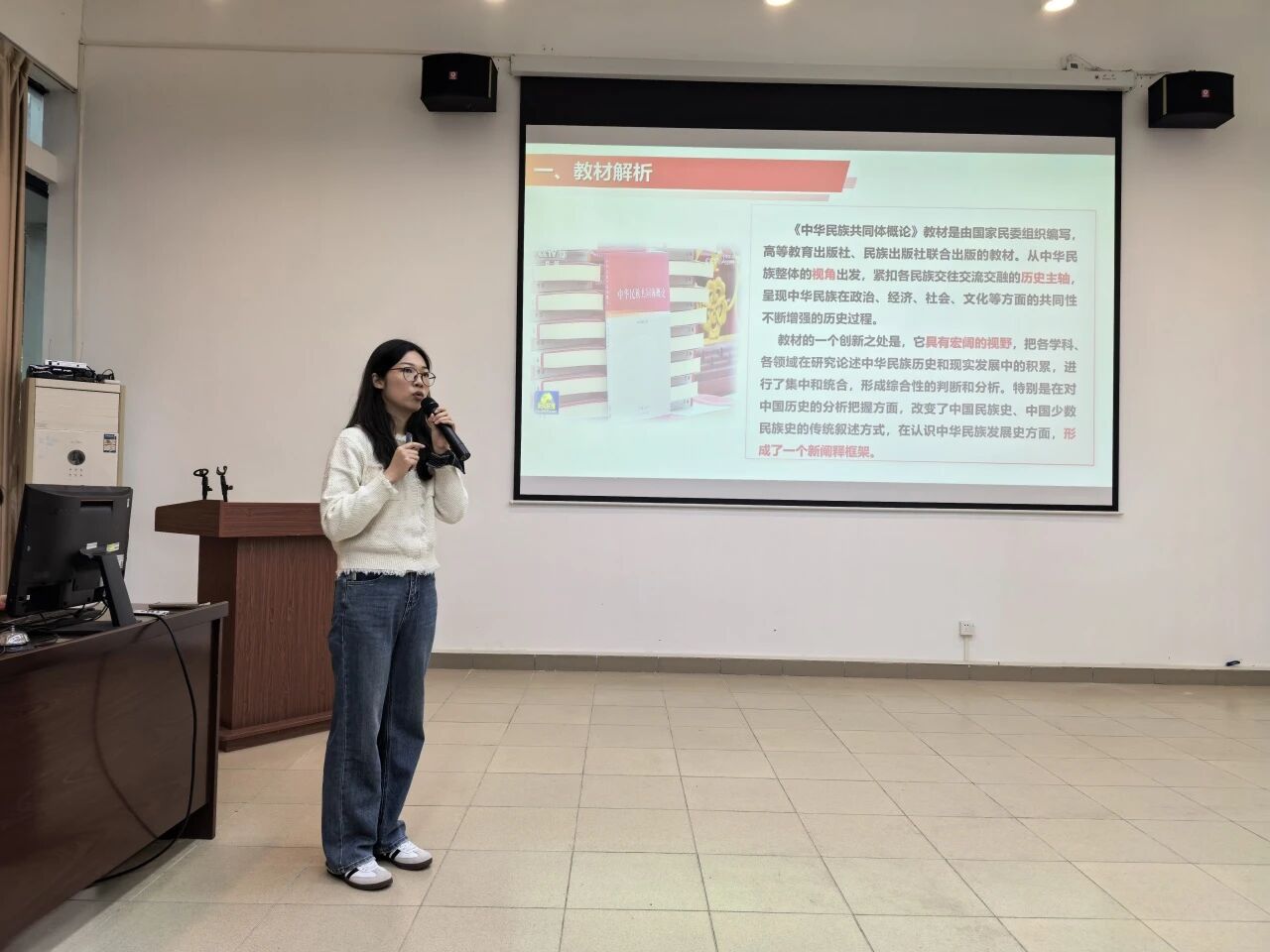 在说课环节,蔡伟华副教授、吴祖妍老师、刘演杭老师、聂沉香教授四位教师分别就“大学生心理健康教育”、“中华民族共同体概论”、“毛泽东思想和中国特色社会主义理论体系概论”、“思想道德与法治”等课程的相关内容进行说课展示,他们从教材解析、学情分析、教学目标与重难点、教法学法、教学设计、教学过程、教学评价与反思等多个维度系统呈现教学思路。