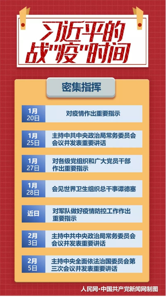 武汉新型冠状病毒肺炎疫情发生后,1月7日,我主持召开中央政治局常委会会议时,就对新型冠状病毒肺炎疫情防控工作提出了要求。1月20日,我专门就疫情防控工作作出批示,指出必须高度重视疫情,全力做好防控工作,要求各级党委和政府及有关部门把人民群众生命安全和身体健康放在第一位,采取切实有效措施,坚决遏制疫情蔓延势头。1月22日,鉴于疫情迅速蔓延、防控工作面临严峻挑战,我明确要求湖北省对人员外流实施全面严格管控。正月初一,我再次主持召开中央政治局常委会会议,对疫情防控特别是患者治疗工作进行再研究、再部署、再动员,并决定成立中央应对疫情工作领导小组。
