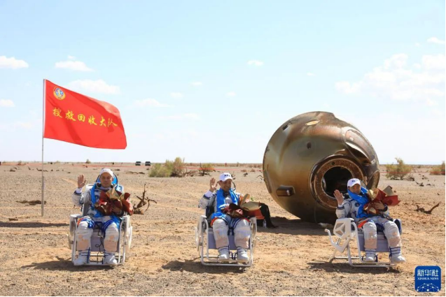 2021年9月17日,神舟十二号载人飞船返回舱在东风着陆场成功着陆。这是航天员聂海胜(中)、刘伯明(右)、汤洪波安全顺利出舱。新华社记者琚振华摄