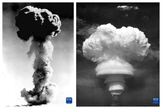 1964年10月16日我国第一颗原子弹爆炸成功,1967年6月17日我国第一颗氢弹空爆试验成功。左图为原子弹爆炸情景,右图为氢弹爆炸情景。