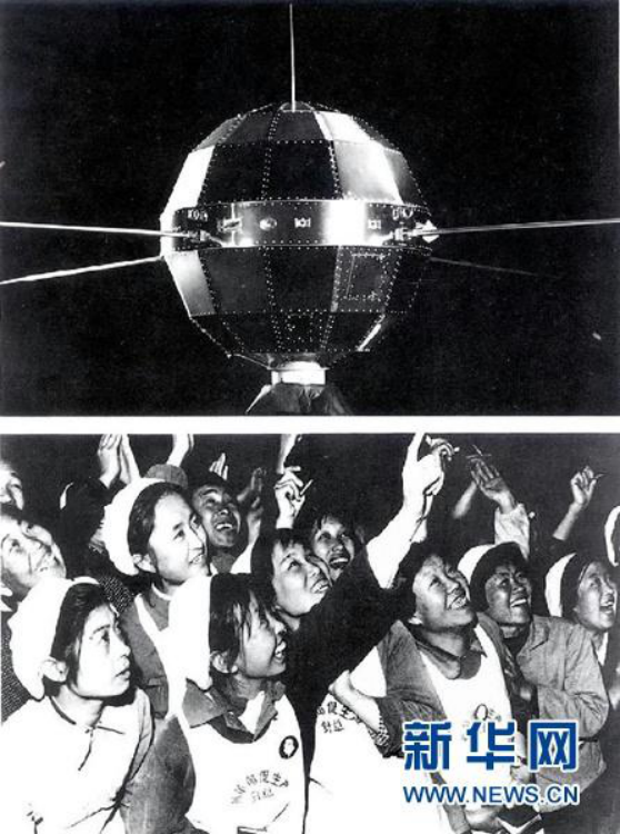 上图为我国第一颗人造地球卫星“东方红一号”;下图为人们争相眺望“东方红一号”通过北京上空(资料照片)。 新华社发