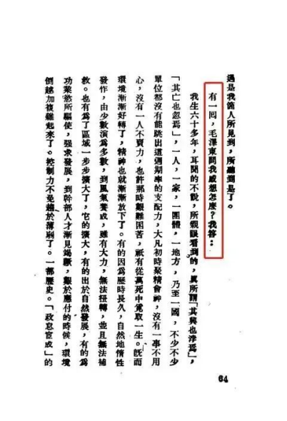 “我生六十多年,耳闻的不说,所亲眼看到的,真所谓‘其兴也勃焉’,‘其亡也忽焉’,一人,一家,一团体,一地方,乃至一国,不少单位都没有能跳出这周期率的支配力……一部历史,‘政怠宦成’的也有,‘人亡政息’的也有,‘求荣取辱’的也有。总之没有能跳出这周期率。”