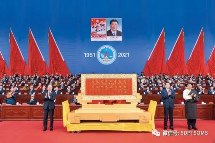 8 月19 日,庆祝西藏和平解放70 周年大会在拉萨隆重举行。中共中央政治局常委、全国政协主席、中央代表团团长汪洋向西藏自治区、西藏军区、武警西藏总队、西藏自治区政法系统、中国佛协西藏分会分别赠送了中共中央总书记、国家主席、中央军委主席习近平题词的“建设美丽幸福西藏 共圆伟大复兴梦想”贺匾和贺幛 黄敬文摄/ 本刊